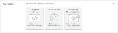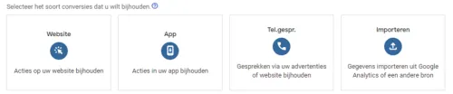 In terms of conversion measurement in Google Ads, we recommend using the Google Ads conversion tag (in the image above: “website”). Later in this blog, you will read why this is recommended. There are several ways to install the tag on your website. Below are the two most common methods: