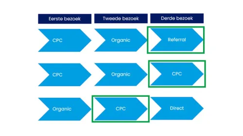 Conversion attribution is the process of assigning conversions to the different channels a user comes from before they make a conversion. Within Google Analytics, a “last-click” model is used for conversion attribution. This means that the conversion is assigned to the last channel the user clicked on before making a conversion, except for direct traffic. In the image below, you will find the channel to which Google Analytics assigns the conversion outlined in green. In the bottom row, the last visit before the conversion is the channel ‘direct’. Since Google Analytics does not assign conversions to direct traffic, the conversion is assigned to the CPC channel in that case.