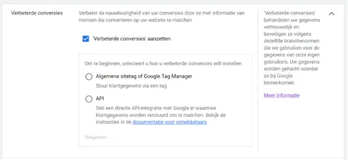 Enhanced conversions can be set up in multiple ways. This depends on how the conversion tag is set up on the website. You can choose from: