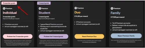 Spotify also taps into this well by offering different subscriptions, such as Individual, Student, Duo, and Family. They mark the “Individual” subscription with a striking pink button “Try it free for 3 months” and emphasize the free trial period. This attracts users' attention and encourages them to choose this option, especially since it's the first option they see and immediately seems attractive due to the free offer. This is a good example of how you can subtly steer users towards a desired choice with Choice Architecture.