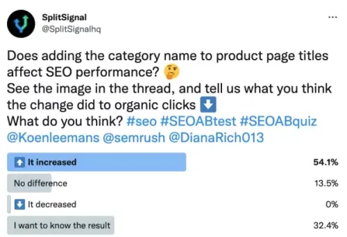 Every two weeks, senior SEO consultant Koen Leemans writes about an interesting SEO A/B test case. The tests are conducted in collaboration with Semrush and their testing tool SplitSignal. Prior to the test, we asked the Twitter followers of SplitSignal for an estimation of the result. According to them, what is the effect of adding category names to product page titles within an e-commerce website?