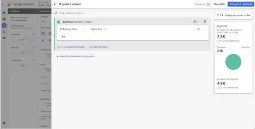 Next, we choose the + at segments to add a segment. For this example, we create a segment for organic traffic. We do this through the following steps: