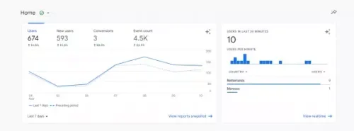 The next step is to view the results of the above metrics using a report. What immediately stands out when opening GA4 is that there are far fewer standard reports under the Reports heading in the left menu. We do see a few familiar items, such as 'Realtime' and 'Acquisition'. And under 'engagement', we see overviews such as 'Conversions' and other event-based analyses. However, these are far fewer than are visible by default in UA. This is because you have the option in GA4 to perform and set up many more analyses yourself. This can be done in two different ways: