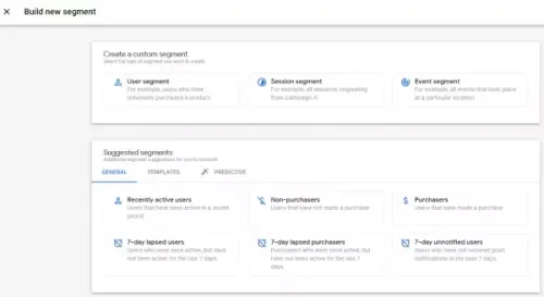 Another important advantage of creating custom reports is the ability to apply various more advanced segments. There are standard segments available based on user, event, and session. But you can also choose advanced segments, such as users who have not made a purchase or even choose from one of the segments based on predictive models. This makes it clear which users are most likely to make a purchase in the next 7 days.
