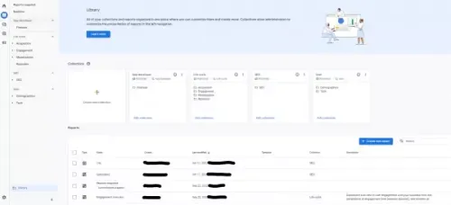 Another way to create and view reports is by adding them to the navigation. This is the ultimate way to completely customize the interface to your needs and objectives. You need an editor role to create a collection. Each property can contain a maximum of 7 collections. Note that this is immediately adjusted for every user of this interface. You can add a report to the left menu by clicking the library icon that appears at the bottom of the reports menu. Then select one of the ready-made reports or create a new report by clicking the “+Create new Report” button.
