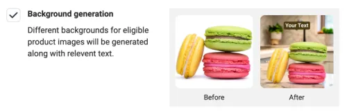 What this AI-generation feature actually does is generate different backgrounds for your image using AI. Additionally, a text overlay can also be added based on your input. This text can come from the headline of your ad, but it is also possible that text extraction optimization (the next feature) is the input for this text.