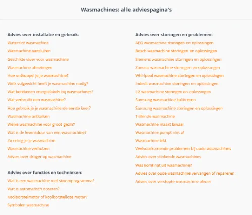 Take, for example, a store like Expert. They use topic clusters by addressing frequently asked questions and subtopics that are less competitive than the broad keyword “washing machine”. This results in an increase in website traffic over a wide range of related keywords, indirectly boosting the visibility and traffic to the main page about washing machines. These strategic subclusters refer back to the main page, showing search engines that they possess in-depth knowledge about washing machines – a testament to their authority in this niche.