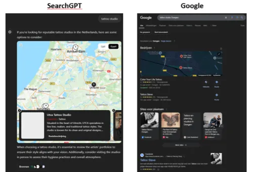 The real win goes to short search queries that we enter most often. If you enter something simple like tattoo studio, ChatGPT gives some places in Amsterdam, Rotterdam and Utrecht. Not very relevant if you're searching from Dongen in our case. Here Google proves its market leader position. Within Google you get locations near you and results about the best tattoo studios in the Netherlands, much more relevant.