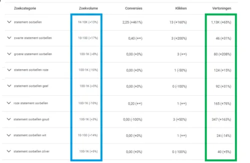 Here you see an example where "statement earrings" and color are added in the titles. There is a clear uplift in impressions for these more specific searches.