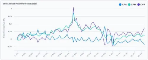 Consumer buying behavior via META is well represented in the graph below. It shows that the conversion rate increases towards Black Friday and the holidays, and that the cost per purchase is relatively low from November to mid-December. Furthermore, you see an increase in the cost per 1000 impressions (CPM) towards the holidays, with a peak during the Black Friday period. This indicates that there is more competition, making a well-thought-out strategy crucial to distinguish your company. Due to the higher CPM, it's also extra important that your budget is used even more effectively. A strong strategy is therefore essential to get the most out of your advertising spend.