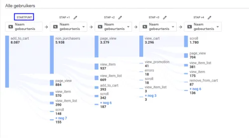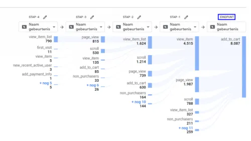 Because GA4 is entirely event-based, it is possible to see all user actions in a navigation flow. This makes it much easier to see and understand which steps a customer takes before, for example, deciding to add a product to the wishlist. The advantage of path exploration is that you can investigate the navigation flow from a starting point or an endpoint. It is possible to investigate which events led to a customer adding a product to the shopping cart, but also which steps a customer takes after a product is added to the shopping cart.