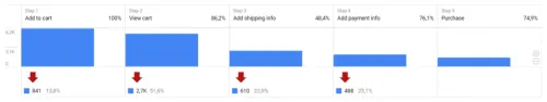 Once you have gained insight into the steps the customer takes, it is also possible to add them to a funnel. In GA4, you can customize this funnel entirely to your own preference. In the example below, this funnel again starts with adding a product to the shopping cart. Then how many of these users also view their cart, and then how many of them fill in the required information and ultimately make a purchase. This way, you can easily see where customers drop out of the checkout process. For example, if you see a large drop between shipping information and payment information, it might be wise to investigate whether you are offering the right payment options.