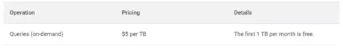 - There are minimal costs for BigQuery in the form of running queries and storage, but there is a threshold, where you only have to pay if you exceed it. For example, the first 10GB of data storage is free, and the first 1TB of queries run is free. For the majority of our clients, these thresholds are not exceeded, keeping the costs minimal. More about the costs in the tables below.